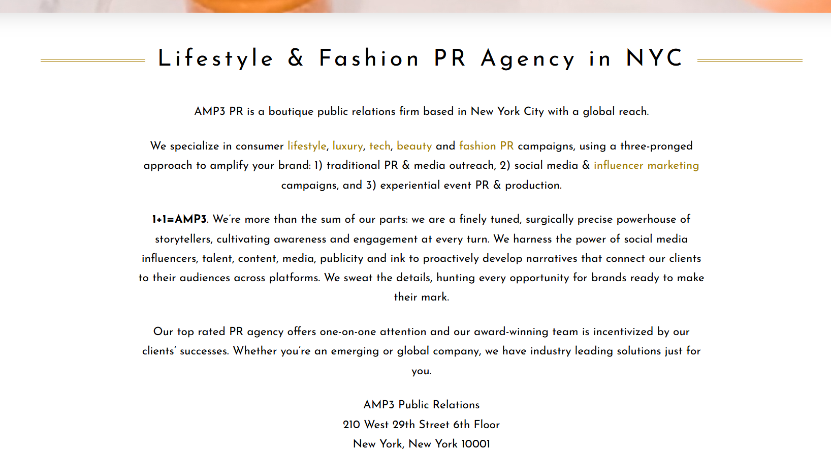 AMP3 PR is one of the top New York City influencer marketing agencies known for its boutique approach and long-standing presence in the industry. Operating at the intersection of PR and influencer marketing, AMP3 has carved out a niche in fashion, beauty, lifestyle, and entertainment by delivering authentic, results-driven campaigns. This influencer marketing agency in NYC stands out for its customised strategies, whether it’s influencer gifting, experiential events, or full-scale ambassador programs.