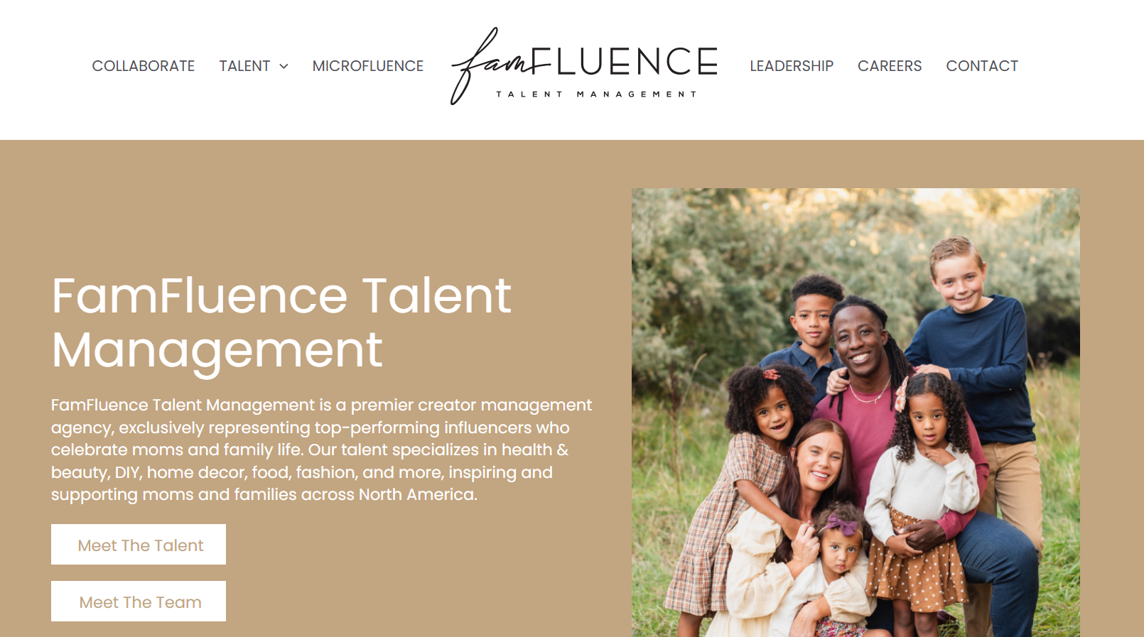 FamFluence is a New York-based influencer agency that centres its work around family-oriented creators. With partnerships spanning parenting, entertainment, and educational content, they’ve worked with iconic brands like Disney and Mattel. FamFluence not only provides talent management and campaign execution but also brings a deep understanding of family values and kid-safe content guidelines, making them a go-to for brands targeting Gen Alpha and Millennial parents.