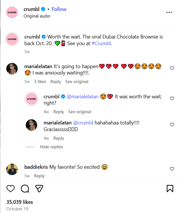 Crumbl reinforces the UGC loop by staying active. It responds quickly and treats each post as a touchpoint. Early brand activity often triggers more engagement from viewers. And for creators, a reply from the brand makes the effort feel valued.