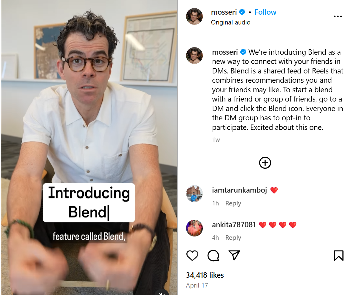 For marketers, Blend introduces a new avenue for organic discovery. If a Reel gets shared into enough Blends, it gains access to tightly-knit groups primed for conversation—a far cry from the one-and-done viral model.