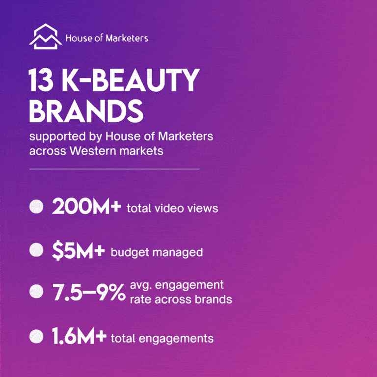 Over the past 12 months, House of Marketers has worked with 13 K-beauty brands across Western markets, managing $5,000,000+ in beauty influencer marketing spend and driving an estimated 200M+ video views and 1.6M engagements.