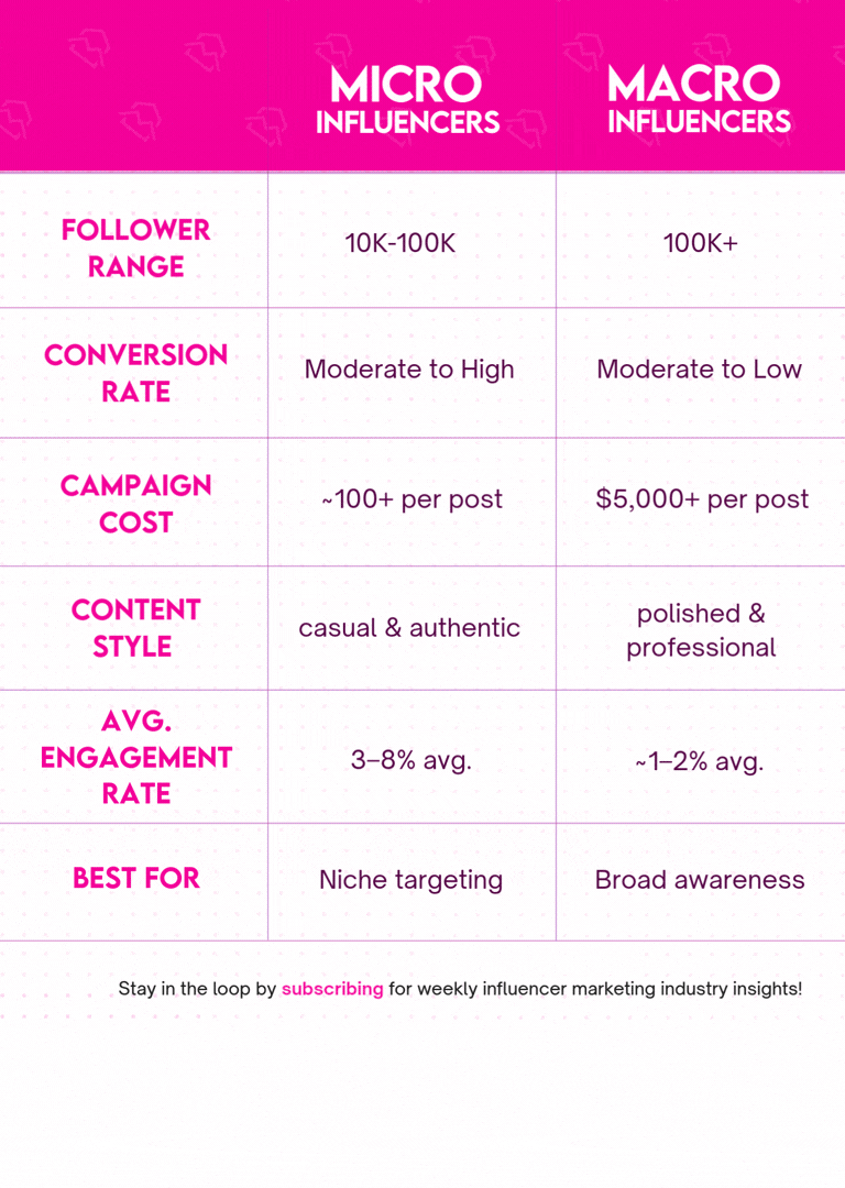 - Macro influencers (100k–1M followers) offer scale, visibility, and strong brand awareness, but often at a higher cost and lower engagement rates.