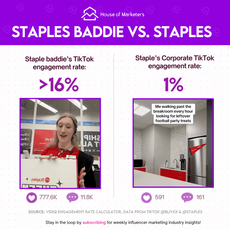 When Staples Baddie became viral, Staples acknowledged it. They commented, liked posts, and sent a care package. What they did not do is immediately wrap it in a paid campaign, put a script in her hands, or start A/B testing her thumbnails. The moment you over-produce organic content, you kill the thing that made it work.
