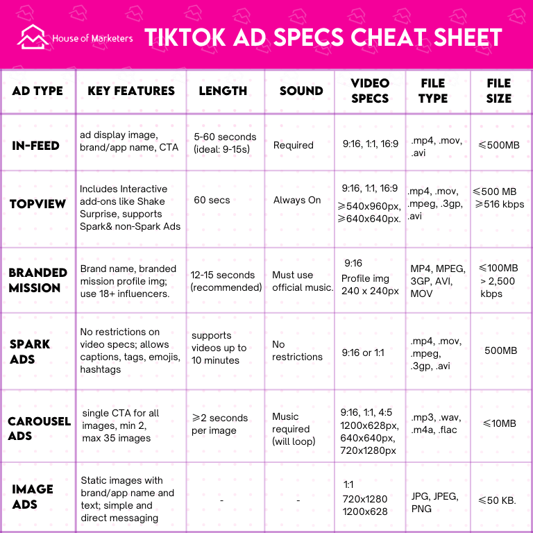 The ad specs for this type of ad are varied. Hence, for more information head over to TikTok.