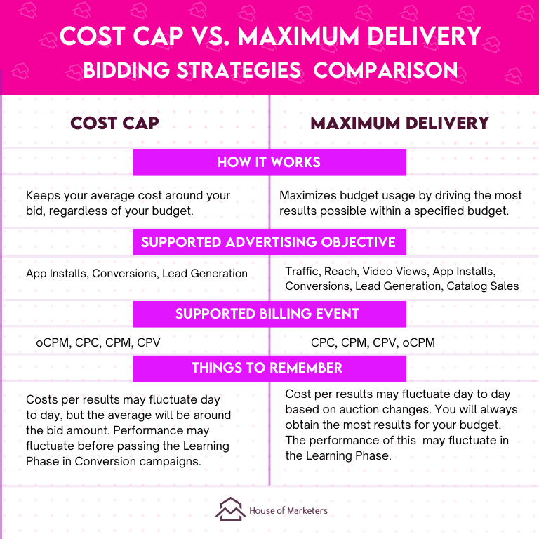 - Match your bid strategy to your goal: Cost Cap is great for keeping costs predictable, while Maximum Delivery works for high-volume campaigns.