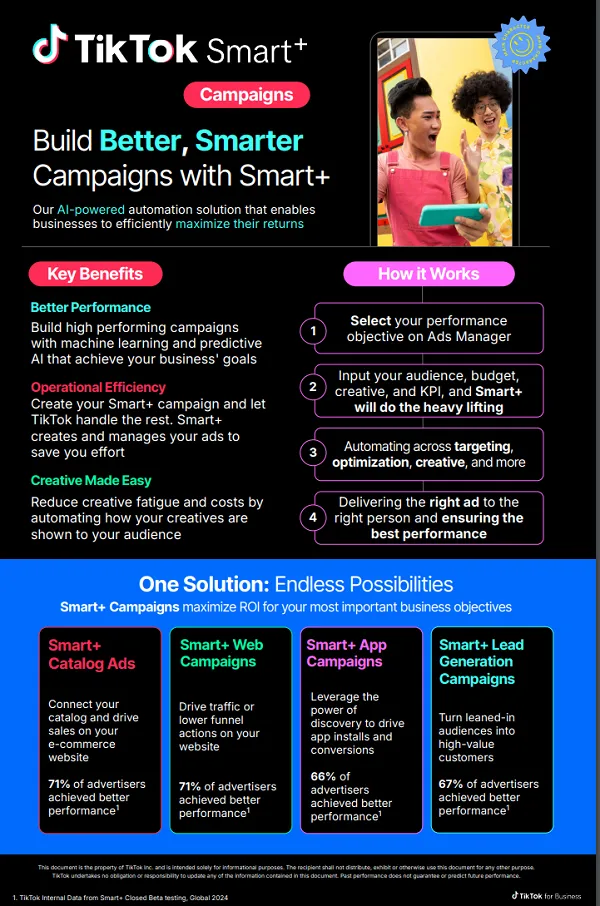 Smart+ is TikTok’s all-in-one performance solution that automates your social media ad campaigns from start to finish. That means you can set up a campaign, and Smart+ takes care of the rest—from targeting and bidding to creative optimisation. It’s like having a personal assistant for your TikTok ads, helping you reach the right people with the right ads.