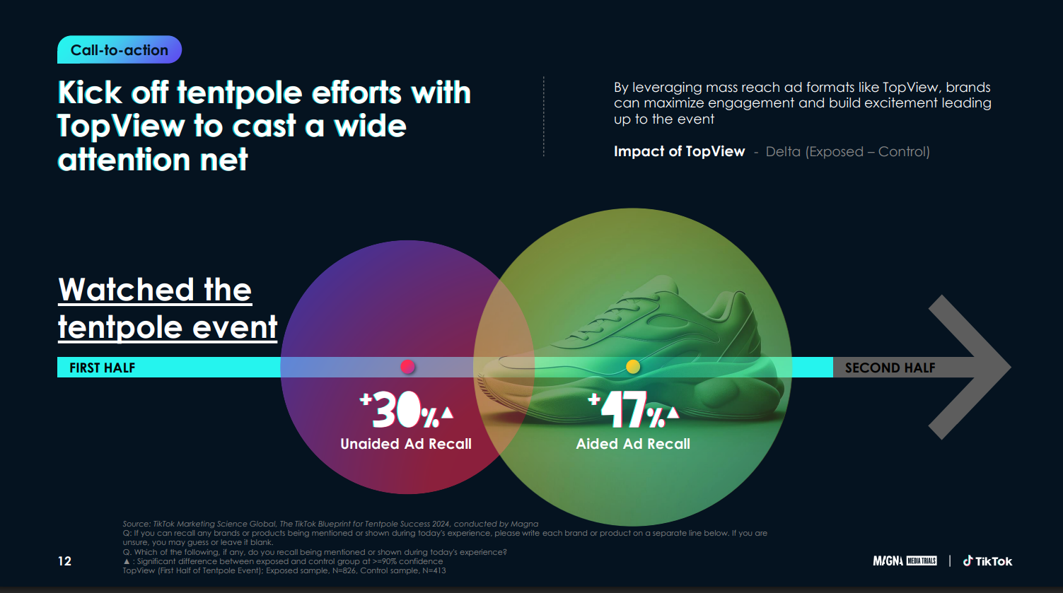 Brands that use TopView Ads during major events experience a +30% increase in unaided recall and a +47% boost in aided recall.