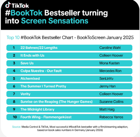 TikTok’s #BookToScreen BookTok Bestseller List highlights TikTok’s role in which books are gaining traction on the platform. These trends are further influencing studios and streaming platforms in deciding which stories to adapt to the screen.