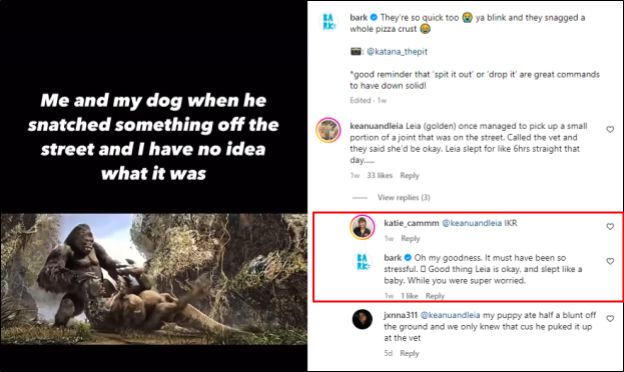 Bark engages its audience by showing personality and having fun with its community of dog lovers. Their playful content, like humorous posts and dog-themed puns, helps them build a likeable image that resonates with their audience. This approach is highlighted in the social media strategy of Dollar Shave Club as well.