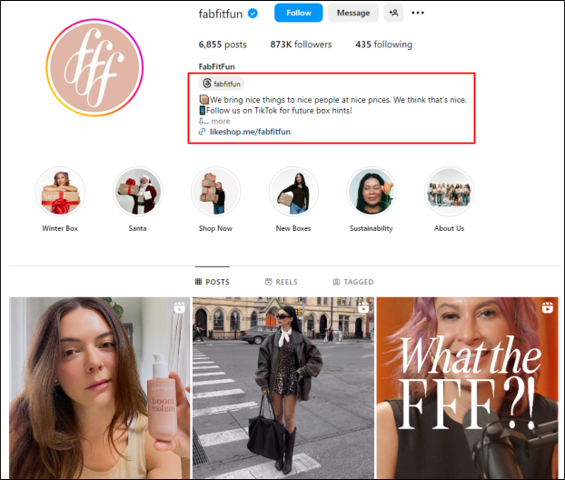 FabFitFun effectively uses social media ads and targeted discounts to convert followers into subscribers. They cleverly highlight their USP in their bio, while also promoting their TikTok account with a playful FOMO message, encouraging users to follow and not miss out on exclusive deals and content.